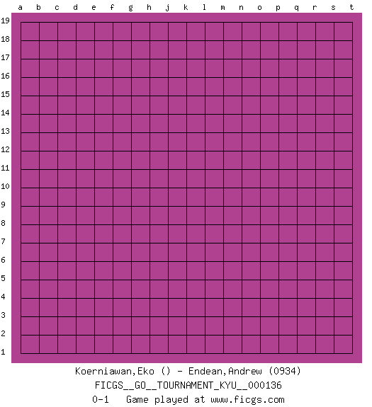 Last move : 0-1 2012 September 7 5:27:54 [Event "FICGS__GO__TOURNAMENT_KYU__000136"] [Site "FICGS"] [Date "2012.06.06"] [Round "1"] [Black "Koerniawan,Eko"] [White "Endean,Andrew"] [Result "0-1"] [Rating 2 "0934"] 0-1 This go game has been lost on time (started : 2012.06.06 21:53:21) Here are the names of the openings (joseki) played in the four corners : Player White won this Go (weiqi, baduk) game. Follow this game move after move (download)Don't make dango's. (Anonymous) Lamb in skin of tiger, still fears the wolf. (Chinese proverb)