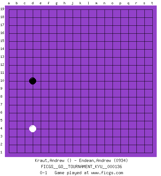 Last move : 0-1 2012 September 8 17:37:46 [Event "FICGS__GO__TOURNAMENT_KYU__000136"] [Site "FICGS"] [Date "2012.06.06"] [Round "1"] [Black "Kraut,Andrew"] [White "Endean,Andrew"] [Result "0-1"] [Rating 2 "0934"] 1.d10 d4 0-1 This go game has been lost on time (started : 2012.06.06 21:53:21) Here are the names of the openings (joseki) played in the four corners : Corner d4 : d4 0-1 Hoshi (Hwajeom, Seongjeom, Xingwei`) 4-4 Point. The star or hoshi (4-4) point, emphasizing influence at the potential expense of territory. Player White won this Go (weiqi, baduk) game. Follow this game move after move (download)The nature of a game comes from what is played, but it's the sensitivity to the possible and the impossible that gives it value. (Pierre Audouard) He who defends everything defends nothing. (Frederick the Great)
