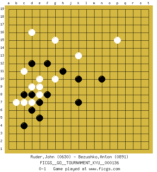 Last move : 0-1 2012 September 21 19:53:58 [Event "FICGS__GO__TOURNAMENT_KYU__000136"] [Site "FICGS"] [Date "2012.06.06"] [Round "1"] [Black "Ruder,John"] [White "Bezushko,Anton"] [Result "0-1"] [Rating 1 "0630"] [Rating 2 "0891"] 1.n10 g10 2.k7 k13 3.e5 p15 4.k10 d16 5.h11 e10 6.f12 d7 7.f8 d9 8.d12 g15 9.c4 c11 10.c8 c7 11.d8 e8 12.e7 e9 13.d6 b7 0-1 This go game has been lost on time (started : 2012.06.06 21:53:21) Here are the names of the openings (joseki) played in the four corners : Corner d16 : d16 h11 Hoshi (Hwajeom, Seongjeom, Xingwei`) 4-4 Point. The star or hoshi (4-4) point, emphasizing influence at the potential expense of territory. Corner d4 : e5 d7 Go-no-go (Wu~wu~) 5-5 Point. The 5-5 was experimented with briefly during the "New Fuseki" movement in Japan in the 1930s. The 5-5 point has not retained popularity because the 4-4 hoshi (star) point strikes a better balance between influence and territory. As one can see from the variations, though, the 5-5 is playable. Player White won this Go (weiqi, baduk) game. Follow this game move after move (download)Don't make compact groups of stones. (Anonymous) The meaning of life is that it is to be lived, and it is not to be traded and conceptualized and squeezed into a pattern of systems. (Bruce Lee)