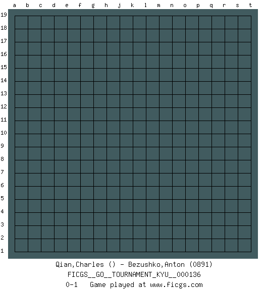 Last move : 0-1 2012 September 7 5:27:54 [Event "FICGS__GO__TOURNAMENT_KYU__000136"] [Site "FICGS"] [Date "2012.06.06"] [Round "1"] [Black "Qian,Charles"] [White "Bezushko,Anton"] [Result "0-1"] [Rating 2 "0891"] 0-1 This go game has been lost on time (started : 2012.06.06 21:53:21) Here are the names of the openings (joseki) played in the four corners : Player White won this Go (weiqi, baduk) game. Follow this game move after move (download)Good moves and bad moves are bedfellows. (Anonymous) For peace of mind, resign as general manager of the universe. (Douglas Adams)