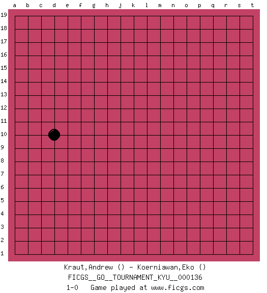 Last move : 1-0 2012 September 11 6:19:34 [Event "FICGS__GO__TOURNAMENT_KYU__000136"] [Site "FICGS"] [Date "2012.06.06"] [Round "1"] [Black "Kraut,Andrew"] [White "Koerniawan,Eko"] [Result "1-0"] 1.d10 1-0 This go game has been lost on time (started : 2012.06.06 21:53:21) Here are the names of the openings (joseki) played in the four corners : Player Black won this Go (weiqi, baduk) game. Follow this game move after move (download)Avoid the plate connection. (Anonymous) I've lost money so fast in these clubs it's left me reeling. I've read every poker book ever written, but the only way to get better at the game is to go out and play with people who are really good. The problem is, you stand to lose a lot of money doing it. (Matt Damon)