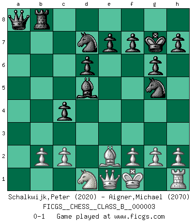 Last move : 0-1 2006 June 3 9:31:28 [Event "FICGS__CHESS__CLASS_B__000003"] [Site "FICGS"] [Date "2006.05.14"] [Round "1"] [White "Schalkwijk,Peter"] [Black "Aigner,Michael"] [Result "0-1"] [WhiteElo "2020"] [BlackElo "2070"] 1.Nf3 d6 2.e4 g6 3.d4 Bg7 4.Nc3 a6 5.Be3 b5 6.Qd2 Bb7 7.Bd3 Nd7 8.Ke2 c5 9.Kf1 Ngf6 10.d5 c4 11.Be2 O-O 12.a3 a5 13.Bd4 b4 14.axb4 axb4 15.Rxa8 Qxa8 16.Nd1 Nxe4 17.Qxb4 Rb8 18.Bxg7 Bxd5 19.Qe1 Kxg7 20.Ng5 Nxg5 0-1 Reti Opening Kingside Castling by player Black (move 11) Player Black won this chess game. Follow this game move after move (download)I play correspondence chess because it is both art and science while chess is art only. (A player at FICGS) Ich brauche nur einen Blick auf das Schachbrett zu werfen, und weiß schon, was in der Stellung steckt, was geschehen kann und was geschehen wird. Alle übrigen suchen und prüfen, ich aber weiß es! (José Raúl Capablanca) Yo adoro todas la posiciones. Denme una partida posicional difícil, y la jugaré. Pero posiciones totalmente ganadas, no las tolero. (Hein Donner) Il vaut toujours mieux jouer un plan faux de façon logique que de n'avoir pas de plan du tout. (Victor Kortchnoï) The real danger is not that computers will begin to think like men, but that men will begin to think like computers. (Sydney J. Harris)