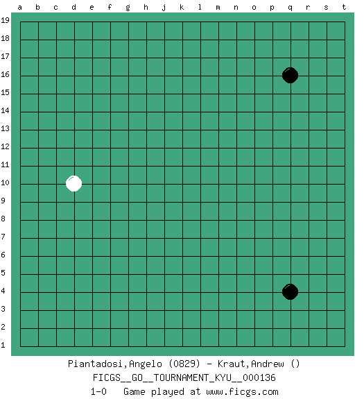 Last move : 1-0 2012 September 8 17:37:46 [Event "FICGS__GO__TOURNAMENT_KYU__000136"] [Site "FICGS"] [Date "2012.06.06"] [Round "1"] [Black "Piantadosi,Angelo"] [White "Kraut,Andrew"] [Result "1-0"] [Rating 1 "0829"] 1.q16 d10 2.q4 1-0 This go game has been lost on time (started : 2012.06.06 21:53:21) Here are the names of the openings (joseki) played in the four corners : Corner q4 : q4 1-0 Hoshi (Hwajeom, Seongjeom, Xingwei`) 4-4 Point. The star or hoshi (4-4) point, emphasizing influence at the potential expense of territory. Player Black won this Go (weiqi, baduk) game. Follow this game move after move (download)Big groups never die. (Anonymous) Chess is everything: art, science and sport. (Anatoly Karpov)