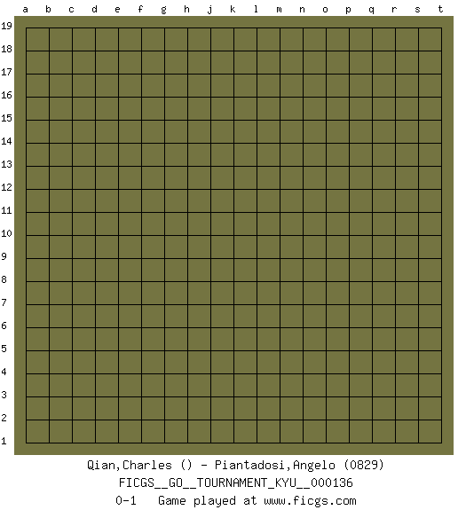 Last move : 0-1 2012 September 7 5:27:54 [Event "FICGS__GO__TOURNAMENT_KYU__000136"] [Site "FICGS"] [Date "2012.06.06"] [Round "1"] [Black "Qian,Charles"] [White "Piantadosi,Angelo"] [Result "0-1"] [Rating 2 "0829"] 0-1 This go game has been lost on time (started : 2012.06.06 21:53:21) Here are the names of the openings (joseki) played in the four corners : Player White won this Go (weiqi, baduk) game. Follow this game move after move (download)Learning josekis by heart is useless if you don't try departing from them. (Pierre Audouard) You think that education is too expensive ? Try ignorance. (Derek Bok)