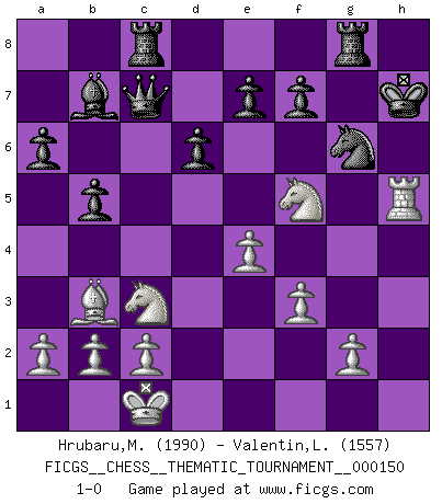 Last move : 1-0 2012 August 16 17:45:51 [Event "FICGS__CHESS__THEMATIC_TOURNAMENT__000150"] [Site "FICGS"] [Date "2012.06.06"] [Round "1"] [White "Hrubaru,Mircea"] [Black "Valentin,Laurentiu"] [Result "1-0"] [WhiteElo "1990"] [BlackElo "1557"] 1.e4 c5 2.Nf3 d6 3.d4 cxd4 4.Nxd4 Nf6 5.Nc3 g6 6.Be3 Bg7 7.f3 O-O 8.Qd2 Nc6 9.Bc4 a6 10.h4 Ne5 11.Bb3 b5 12.h5 Nxh5 13.Bh6 Bb7 14.Rxh5 gxh5 15.Qg5 Ng6 16.Bxg7 Kxg7 17.Nf5+ Kh8 18.O-O-O Qc7 19.Rh1 Rac8 20.Qh6 Rg8 21.Qxh7+ Kxh7 22.Rxh5+ 1-0 Sicilian : Dragon, Yugoslav attack, 7...O-O Kingside Castling by player Black (move 7) Queenside Castling by player White (move 18) Player White won this chess game. Follow this game move after move (download)There are two classes of men; those who are content to yield to circumstances and who play whist; those who aim to control circumstances, and who play Chess. (Mortimer Collins) Im Hotelzimmer gab es nur zwei Schaben. (Über die Turnierbedingungen) (Peter Swidler) Un buen jugador siempre tiene buena suerte. (José Raúl Capablanca) Ce n'est pas pour s'amuser qu'il joue aux échecs : il célèbre un culte. (Vladimir Nabokov) It is the aim of the modern school, not to treat every position according to one general law, but according to the principle inherent in the position. (Richard Reti)