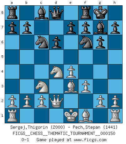 Last move : 0-1 2012 September 17 7:26:10 [Event "FICGS__CHESS__THEMATIC_TOURNAMENT__000150"] [Site "FICGS"] [Date "2012.06.06"] [Round "1"] [White "Sergej,Thigorin"] [Black "Pech,Stepan"] [Result "0-1"] [WhiteElo "2000"] [BlackElo "1441"] 1.e4 c5 2.Nf3 d6 3.d4 cxd4 4.Nxd4 Nf6 5.Nc3 g6 6.Be3 Bg7 7.f3 O-O 8.Qd2 Nc6 0-1 This chess game has been lost on time (started : 2012.06.06 23:55:20) Sicilian : Dragon, Yugoslav attack, 7...O-O Kingside Castling by player Black (move 7) Player Black won this chess game. Follow this game move after move (download)The Chess pieces are the block alphabet which shapes thoughts; and these thoughts, although making a visual design on the chessboard, express their beauty abstractly, like a poem. (Marcel Duchamp) Aljechin war kein Nazi. Er war ein Opportunist. Ein schrecklicher Mann. Er liebte Geld über alles und würde für Geld ein Jude, ein Katolik oder ein Protestant werden. (Miguel Najdorf) Cuando veas una buena jugada, trata de encontrar otra mejor. (Emanuel Lasker) La guerre est enfant de la passion, la passion est enfant du narcissisme et le narcissisme est l'enfant. (...) Une autre partie ? (Thibault de Vassal) Once you start thinking you have nothing left to learn, you have everything to learn. (Steve Badget)