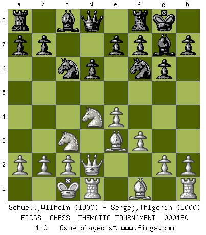 Last move : 1-0 2012 September 17 7:26:10 [Event "FICGS__CHESS__THEMATIC_TOURNAMENT__000150"] [Site "FICGS"] [Date "2012.06.06"] [Round "1"] [White "Schuett,Wilhelm"] [Black "Sergej,Thigorin"] [Result "1-0"] [WhiteElo "1800"] [BlackElo "2000"] 1.e4 c5 2.Nf3 d6 3.d4 cxd4 4.Nxd4 Nf6 5.Nc3 g6 6.Be3 Bg7 7.f3 O-O 8.Qd2 Nc6 9.O-O-O 1-0 This chess game has been lost on time (started : 2012.06.06 23:55:20) Sicilian : Dragon, Yugoslav attack, 7...O-O Kingside Castling by player Black (move 7) Queenside Castling by player White (move 9) Player White won this chess game. Follow this game move after move (download)The tactician knows what to do when there is something to do; whereas the strategian knows what to do when there is nothing to do. (Gerald Abrahams) Wie gewinnt Tal? Er entwickelt alle seine Figuren in die Brettmitte und opfert sie dann irgendwo. (Robert James Fischer) No volvere nunca a jugar contigo. Has insultado a mi amigo. - cuando un oponente se maldijo por una mala jugada (Miguel Najdorf) Celui qui prend des risques peut perdre, celui qui n'en prend pas perd toujours. (Xavier Tartacover) Beta. Software undergoes beta testing shortly before it's released. Beta is latin for still doesn't work. (Anonymous)