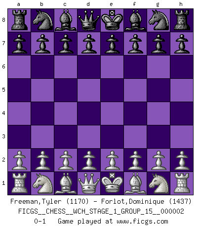 Last move : 0-1 2007 February 15 16:26:34 [Event "FICGS__CHESS__WCH_STAGE_1_GROUP_15__000002"] [Site "FICGS"] [Date "2007.01.16"] [Round "1"] [White "Freeman,Tyler"] [Black "Forlot,Dominique"] [Result "0-1"] [WhiteElo "1170"] [BlackElo "1437"] 0-1 This chess game has been lost on time (started : 2007.01.16 15:26:24) Player Black won this chess game. Follow this game move after move (download)Everything is in a state of flux, and this includes the world of Chess. (Mikhail Botvinnik) Die starken Figuren des Gegners muss man abtauschen. (José Raúl Capablanca) ¿Esta Bobby Fischer algo cuerdo?. (Salo Flohr) Les pièces de l'échiquier étaient impitoyables. Elles le retenaient, elles l'absorbaient. Il y avait de l'horreur en cela, mais aussi une harmonie unique. Car, qu'y a-t-il dans le monde, à part les échecs ? (V. Nabokov) Strategy without tactics is the slowest route to victory. Tactics without strategy is the noise before defeat. (Sun Tzu)