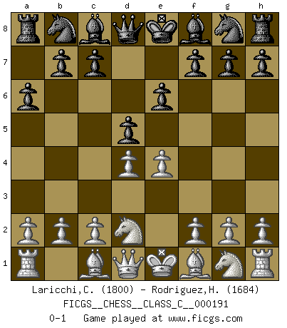 Last move : 0-1 2012 October 20 22:10:11 [Event "FICGS__CHESS__CLASS_C__000191"] [Site "FICGS"] [Date "2012.06.07"] [Round "1"] [White "Laricchi,Claudio"] [Black "Rodriguez,Henderb"] [Result "0-1"] [WhiteElo "1800"] [BlackElo "1684"] 1.e4 e6 2.d4 d5 3.Nd2 a6 0-1 This chess game has been lost on time (started : 2012.06.07 6:8:46) French : Tarrasch Player Black won this chess game. Follow this game move after move (download)Life is like a game of Chess, changing with each move. (Chinese proverb) Wenn ich Weiß habe gewinne ich weil ich Weiß habe, wenn ich Schwarz habe gewinne ich weil ich Bogoljubov bin. (Efim Bogoljubov) El Ajedrez es de 30 a 40 por ciento psicología. Uno no cuenta con esto cuando se juega contra una computadora. No lo puedo confundir. (Judith Polgar) Que feriez-vous si vous étiez en train de jouer aux échecs et que la fin du monde arrive ? Je continuerais à jouer. (Saint Borromée) Statistics can be made to prove anything - even the truth. (Author unknown)