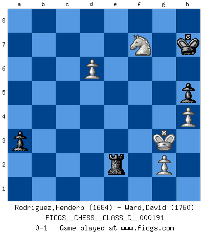 Last move : 0-1 2014 January 28 4:27:43 [Event "FICGS__CHESS__CLASS_C__000191"] [Site "FICGS"] [Date "2012.06.07"] [Round "1"] [White "Rodriguez,Henderb"] [Black "Ward,David"] [Result "0-1"] [WhiteElo "1684"] [BlackElo "1760"] 1.Nf3 f5 2.c4 d6 3.d4 Nf6 4.Nc3 e6 5.e3 Be7 6.Bd3 O-O 7.O-O Qe8 8.e4 a5 9.exf5 exf5 10.Qc2 Ng4 11.h3 Nh6 12.Re1 Qf7 13.Bxh6 gxh6 14.Nd5 Bd8 15.Re2 c6 16.Nc3 Na6 17.a3 Bd7 18.Rae1 Qg7 19.Nd1 f4 20.Kh2 Nc7 21.Nc3 Kh8 22.Re4 Rg8 23.Rg1 Ne6 24.d5 Nc5 25.Rxf4 Bg5 26.Rd4 Raf8 27.Ne2 cxd5 28.Rxd5 Bc6 29.Ned4 Bxd5 30.cxd5 Bf6 31.Nf5 Be5+ 32.Kh1 Qf6 33.Nxe5 Qxe5 34.Nxh6 Rg5 35.Ng4 Qg7 36.f3 Nxd3 37.Qxd3 Qxb2 38.Rb1 Qg7 39.Qd2 h5 40.Ne3 Rg8 41.Rb2 Rg3 42.Qf2 Qd4 43.Qd2 Qxd2 44.Rxd2 Rc8 45.Nf5 Rg6 46.Rb2 Rc3 47.Rxb7 Rxa3 48.Rb8+ Rg8 49.Rb7 Ra1+ 50.Kh2 Ra2 51.Ne3 Re2 52.Rb3 Rg5 53.f4 Rg8 54.Ra3 a4 55.h4 Rb8 56.Nc4 Rb4 57.Nxd6 Rxf4 58.Kh3 Rb4 59.Rg3 Rb3 60.Nf7+ Kh7 61.d6 Rxg3+ 62.Kxg3 a3 0-1 Reti v Dutch Kingside Castling by player Black (move 6) Kingside Castling by player White (move 7) 10 pieces endgame at move 61 : White KNPPP , Black KRRPP WHITE : King + 1 Knight 3 Pawns BLACK : King + 2 Rooks 2 Pawns 9 pieces endgame at move 62 : White KNPPP , Black KRPP WHITE : King + 1 Knight 3 Pawns BLACK : King + 1 Rook 2 Pawns Player Black won this chess game. Follow this game move after move (download)A good sacrifice is one that is not necessarily sound but leaves your opponent dazed and confused. (Rudolph Spielmann) Bis jetzt ist Weiß einer wohlbekannten Analyse gefolgt. Aber jetzt begeht er einen schrecklichen Fehler: Er beginnt seinen eigenen Kopf zu benutzen. (Siegbert Tarrasch) Los errores estan ahí, esperando a que se cometan. (Savielly Tartakower) La guerre est enfant de la passion, la passion est enfant du narcissisme et le narcissisme est l'enfant. (...) Une autre partie ? (Thibault de Vassal) Lamb in skin of tiger, still fears the wolf. (Chinese proverb)