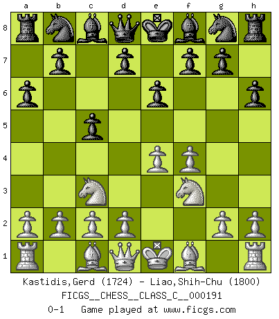 Last move : 0-1 2012 September 20 7:44:27 [Event "FICGS__CHESS__CLASS_C__000191"] [Site "FICGS"] [Date "2012.06.07"] [Round "1"] [White "Kastidis,Gerd"] [Black "Liao,Shih-Chu"] [Result "0-1"] [WhiteElo "1724"] [BlackElo "1800"] 1.e4 c5 2.Nc3 a6 3.f4 e6 4.Nf3 h6 0-1 This chess game has been lost on time (started : 2012.06.07 6:8:46) Sicilian : Closed Player Black won this chess game. Follow this game move after move (download)The King is a fighting piece. Use it ! (Wilhelm Steinitz) Ein Teil des Fehlers ist immer korrekt. (Savielly Grigorievitsch Tartakower) Si el Ajedrez es una ciencia, es la mas inexacta. Si el Ajedrez es un arte, es demasiado inexacto para ser visto como tal. Si el Ajedrez es un deporte, es demasiado esotérico. Si el Ajedrez es un juego, es demasiado exigente para ser solo un juego. Si el Ajedrez es una aventura, es una muy demandante. Si el Ajedrez es una pasión, es una muy gratificante. Si el Ajedrez es la vida, es una muy triste. (Anónimo) Seul un grand joueur sait à quel point il joue faiblement. (Xavier Tartacover) Never risk one's whole fortune unless supported by one's entire army. (Niccolo Machiavelli)