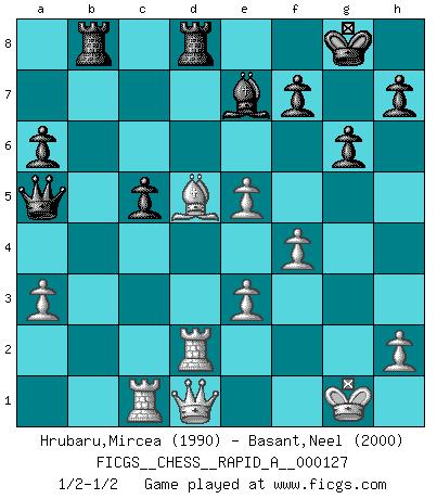 Last move : 1/2-1/2 2012 November 30 8:37:34 [Event "FICGS__CHESS__RAPID_A__000127"] [Site "FICGS"] [Date "2012.06.07"] [Round "1"] [White "Hrubaru,Mircea"] [Black "Basant,Neel"] [Result "1/2-1/2"] [WhiteElo "1990"] [BlackElo "2000"] 1.d4 d5 2.c4 e6 3.Nf3 Nf6 4.g3 Bb4+ 5.Bd2 Be7 6.Bg2 O-O 7.O-O c6 8.Qc2 b6 9.Bf4 Bb7 10.Rd1 Nbd7 11.Nc3 dxc4 12.Nd2 Nd5 13.Nxc4 Nxf4 14.gxf4 Qc7 15.e3 Rad8 16.Rd2 a6 17.Rad1 Rc8 18.a3 g6 19.b4 Rfd8 20.Rc1 Ba8 21.Qd1 Qa7 22.Ne4 Rb8 23.Ne5 Nxe5 24.fxe5 c5 25.bxc5 Bxe4 26.Bxe4 bxc5 27.d5 exd5 28.Bxd5 Qc7 29.f4 Qa5 1/2-1/2 Queen's gambit declined Kingside Castling by player Black (move 6) Kingside Castling by player White (move 7) This chess game ended in a draw. Follow this game move after move (download)It is not a move, even the best move that you must seek, but a realizable plan. (Eugene Znosko-Borovsky) Herr Iljumschinow ist ein etwas merkwürdiger Geschäftsmann: Er arbeitet zusammen mit Leuten wie Muammar al-Gaddafi; früher ist das Saddam Hussein gewesen. (Joel Lautier) Vive, pierde y aprende al observar a tu oponente como gana. (Amber Steenbock) Roi des jeux et jeu des rois, les échecs portent en eux un sentiment d'infini. Ils donnent à celui qui s'est efforcé d'en approfondir les arcanes l'impression de n'être pas à la mesure de l'homme; en fait, ils constituent un résumé de l'univers, un microcosme, et figurent cette grande échelle qui, dans les plans de la lumière descend jusqu'à la matière, qui des abîmes insondables remonte jusqu'en l'infini de Dieu. (Pyrame) Somewhere in the world there is an epigram for every dilemma. (Hendrik Willem van Loon)