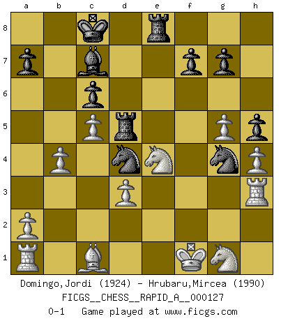 Last move : 0-1 2013 January 23 0:45:6 [Event "FICGS__CHESS__RAPID_A__000127"] [Site "FICGS"] [Date "2012.06.07"] [Round "1"] [White "Domingo,Jordi"] [Black "Hrubaru,Mircea"] [Result "0-1"] [WhiteElo "1924"] [BlackElo "1990"] 1.g4 d5 2.Bg2 c6 3.h3 h5 4.g5 e5 5.d4 e4 6.c4 Bd6 7.Nc3 Ne7 8.h4 Be6 9.Qb3 Nd7 10.c5 Bc7 11.Qxb7 Nf8 12.f3 Nfg6 13.fxe4 dxe4 14.Qb4 Bd5 15.Qa3 Nf5 16.Bxe4 Bxe4 17.Nxe4 Qxd4 18.Qd3 Qxd3 19.exd3 O-O-O 20.Rh3 Rhe8 21.Kf1 Rd5 22.b4 Ne5 23.Nf2 Ng4 24.Ne4 Nd4 0-1 This chess game has been lost on time (started : 2012.06.07 8:42:22) Grob's attack Queenside Castling by player Black (move 19) Player Black won this chess game. Follow this game move after move (download)An attack on the wing should be met by play in the center. (Nimzovitch) Ich bewundere Kasparows phantasievolle Angriffssiege aus den Achtzigern und Neunzigern, aber wenn man sie mit dem Computer überprüft, nimmt der Computer in jeder zweiten Partie die Opfer an, verteidigt sich und gewinnt. (Vladimir Kramnik) Ciertamente, de todas la drogas del mundo, el Ajedrez debe ser el mas placentero permamentemente. (Assiac) Il a essayé de se convaincre qu'il pourrait empêcher toutes les erreurs et ne jamais perdre. L'horreur ! Gary Kasparov au sujet de Robert Fischer. You think that education is too expensive ? Try ignorance. (Derek Bok)
