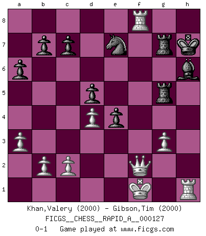 Last move : 0-1 2012 December 4 11:28:28 [Event "FICGS__CHESS__RAPID_A__000127"] [Site "FICGS"] [Date "2012.06.07"] [Round "1"] [White "Khan,Valery"] [Black "Gibson,Tim"] [Result "0-1"] [WhiteElo "2000"] [BlackElo "2000"] 1.e4 h5 2.d4 e6 3.Nf3 d5 4.exd5 exd5 5.Nc3 a6 6.Bd3 Nc6 7.O-O Nf6 8.Re1+ Be7 9.h3 O-O 10.Bg5 Nb4 11.Ne2 Bd6 12.Ne5 Qe8 13.Bxf6 gxf6 14.Nf4 fxe5 15.Qxh5 f5 16.Qg5+ Kh7 17.Qh4+ Kg7 18.Nh5+ Qxh5 19.Qxh5 e4 20.a3 Nc6 21.Qg5+ Kh7 22.Be2 Rf7 23.Rad1 Be7 24.Qe3 Be6 25.f3 Rg7 26.fxe4 fxe4 27.Bg4 Bg5 28.Qg3 Bxg4 29.hxg4 Rd8 30.Rf1 Rd6 31.Rf8 Rh6 32.Qf2 Ne7 33.g3 Rhg6 34.Kg2 Bh6 35.Rh1 Rxg4 36.Kf1 R4g5 0-1 King's pawn Opening Kingside Castling by player White (move 7) Kingside Castling by player Black (move 9) Player Black won this chess game. Follow this game move after move (download)Why must I lose to this idiot ? (Aron Nimzovich) Wenn Capablanka heute auf der Schachbühne erscheinen würde, hätte er ein halbes Jahr gebraucht um sich die Schachtheorie anzueignen. Und dann hätte er alles und jeden besiegt. (Mikhail Moiseyevich Botvinik) Yo he agregado estos principios a la ley: pongan los Caballos en acción antes de que los dos Alfiles sean desarrollados. (Emanuel Lasker) Un footballeur joue avec ses pieds, parfois avec sa tête. Un joueur d'échecs ne joue qu'avec sa tête. Et quand il ne joue plus, il meurt. (Jacob Murray) Perhaps the current trend of many chess professionals taking up the more lucrative pastime of poker is not a wholly negative one. It may not be too late for humans to relearn how to take risks in order to innovate and thereby maintain the advanced lifestyles we enjoy. And if it takes a poker-playing supercomputer to remind us that we can't enjoy the rewards without taking the risks, so be it. (The Chess Master and the Computer, by Garry Kasparov - 2010)