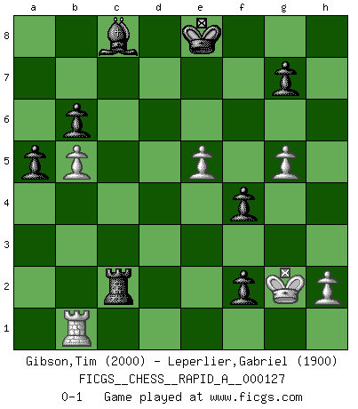 Last move : 0-1 2012 October 30 17:25:57 [Event "FICGS__CHESS__RAPID_A__000127"] [Site "FICGS"] [Date "2012.06.07"] [Round "1"] [White "Gibson,Tim"] [Black "Leperlier,Gabriel"] [Result "0-1"] [WhiteElo "2000"] [BlackElo "1900"] 1.Na3 e5 2.d3 d5 3.g3 Bc5 4.Nf3 Nc6 5.Bg2 f5 6.d4 Bxa3 7.bxa3 e4 8.Ne5 Nxe5 9.dxe5 Ne7 10.O-O Be6 11.Bg5 h6 12.Be3 Nc6 13.Bd4 O-O 14.e3 Qe7 15.Bc3 Qxa3 16.Qd2 b6 17.f4 Rad8 18.Rfb1 d4 19.exd4 Qa4 20.Rb2 Nxd4 21.Rb4 Nf3+ 22.Bxf3 Rxd2 23.Rxa4 Rxc2 24.Bb4 exf3 25.Bxf8 f2+ 26.Kf1 Bd7 27.Rb4 Bc8 28.Rb5 Kxf8 29.Rd1 Ba6 30.a4 Ke8 31.g4 c6 32.Rdb1 cxb5 33.axb5 Bc8 34.g5 a5 35.Kg2 hxg5 36.fxg5 f4 0-1 Durkin's attack Kingside Castling by player White (move 10) Kingside Castling by player Black (move 13) Player Black won this chess game. Follow this game move after move (download)Chess, like love, like music, has the power to make people happy. (Siegbert Tarrasch) Ich liebe den Moment, wenn ich das Ego meines Gegenüber breche. (Robert James Fischer) El Ajedrez es una guerra en un tablero. El objetivo es aplastar la mente del oponente. (Bobby Fischer) On entre au jeu d'Echecs comme on entre en Religion. Pour le joueur d'Echecs, la partie d'Echecs c'est l'office, la messe, le défilé du 1er Mai, le dépôt de gerbe au Monument aux Morts. C'est un drame sacré. (Michel Roos) If computers get too powerful, we can organize them into committees. That'll do them in. (Anonymous)