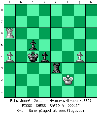 Last move : 0-1 2012 October 3 9:3:34 [Event "FICGS__CHESS__RAPID_A__000127"] [Site "FICGS"] [Date "2012.06.07"] [Round "1"] [White "Riha,Josef"] [Black "Hrubaru,Mircea"] [Result "0-1"] [WhiteElo "2011"] [BlackElo "1990"] 1.e4 e5 2.Nf3 Nf6 3.d4 Nxe4 4.Bd3 d5 5.Nxe5 Nd7 6.Nxd7 Bxd7 7.O-O Qh4 8.c4 O-O-O 9.c5 g5 10.f3 Nf6 11.Be3 Re8 12.Qd2 Rg8 13.Bf2 Qf4 14.Qxf4 gxf4 15.Kh1 Nh5 16.Nc3 c6 17.Rfe1 Be7 18.b4 Ng7 19.Bxh7 Rh8 20.Bd3 Bf5 21.Rad1 Bxd3 22.Rxd3 a6 23.Re2 Kd7 24.a4 Nf5 25.Re5 Ng3+ 26.Kg1 Rxh2 27.Bxg3 fxg3 28.Ne2 Rg8 29.Nxg3 Bh4 30.Kxh2 Bxg3+ 31.Kh3 Bxe5 32.dxe5 Ke6 33.f4 Kf5 34.Rd4 Rh8+ 35.Kg3 Rh1 36.Kf3 Rf1+ 37.Kg3 Ra1 38.b5 Rc1 39.bxa6 bxa6 40.Rb4 Rxc5 41.Rb7 Rc3+ 42.Kf2 Kxf4 43.Rxf7+ Kxe5 44.Re7+ Kf5 45.Rf7+ Ke4 46.Re7+ Kd3 47.Re3+ Kc4 48.Re6 c5 49.g4 d4 50.Rxa6 Re3 0-1 Petrov : Modern attack, Symmetrical variation Kingside Castling by player White (move 7) Queenside Castling by player Black (move 8) 10 pieces endgame at move 43 : White KRPPP , Black KRPPP WHITE : King + 1 Rook 3 Pawns BLACK : King + 1 Rook 3 Pawns 9 pieces endgame at move 43 : White KRPP , Black KRPPP WHITE : King + 1 Rook 2 Pawns BLACK : King + 1 Rook 3 Pawns 8 pieces endgame at move 50 : White KRPP , Black KRPP WHITE : King + 1 Rook 2 Pawns BLACK : King + 1 Rook 2 Pawns Player Black won this chess game. Follow this game move after move (download)As one by one I mowed them down, my superiority soon became apparent. (Jose Capablanca) Frage des Reporters: -Welche besonderen Umstände rechtfertigen das Anhalten der Uhren während einer Turnierpartie? Antwort: -Einen Fotographen zu strangulieren. (Siegbert Tarrasch) Cuando tengo las piezas blancas, yo gano porque soy blanco; Cuando tengo las piezas negras, yo gano porque soy Bogolyubov. (Bogolyubov) Comme les marins qui ont mille raisons différentes d'aller en mer, les joueurs d'échecs en ont tout autant avant de s'installer devant une table et jouer... (Vincent Bertignac, philosophe) Don't be discouraged. It's often the last key in the bunch that opens the lock. (Author unknown)