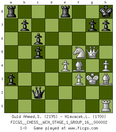 Last move : 1-0 2007 May 6 8:2:17 [Event "FICGS__CHESS__WCH_STAGE_1_GROUP_16__000002"] [Site "FICGS"] [Date "2007.01.16"] [Round "1"] [White "Ould Ahmed,Samy"] [Black "Hlavacek,Ladislav"] [Result "1-0"] [WhiteElo "2195"] [BlackElo "1700"] 1.e4 e5 2.Nf3 d6 3.d4 exd4 4.Nxd4 Nf6 5.Nc3 Be7 6.Bf4 O-O 7.Qd2 Nbd7 8.O-O-O a5 9.f3 a4 10.g4 a3 11.b3 Nb6 12.Kb1 Nfd7 13.Nf5 Nc5 14.h4 Be6 15.g5 f6 16.Bh3 Kh8 17.Nb5 Qd7 18.Nbd4 Bxf5 19.Nxf5 Qe8 20.Qg2 Nba4 21.bxa4 Nxa4 22.Rd3 Nc5 23.Rd5 Qb5+ 24.Kc1 Qb2+ 25.Kd2 c6 26.Rxc5 dxc5 27.Nxe7 Rfd8+ 28.Ke3 Qd4+ 29.Ke2 Qc4+ 30.Kf2 Qxa2 31.Qg4 Re8 32.Nf5 Qxc2+ 33.Kg3 fxg5 34.Qxg5 1-0 Philidor : Exchange variation Kingside Castling by player Black (move 6) Queenside Castling by player White (move 8) Player White won this chess game. Follow this game move after move (download)When I have White, I win because I am white; When I have Black, I win because I am Bogolyubov. (Bogolyubov) Jede Eröffnung ist gut genug um gespielt zu werden, wenn nur ihr Ruf schlecht genug ist. (Savielly Grigorievitsch Tartakower) Hay dos clases de hombres: aquellos que se conforman en dejarse llevar por las circunstancias y que juegan barajas y aquellos decididos a controlar las circunstancias y que juegan al Ajedrez. (Mortimer Collins) RxDa4 pat (...) Animated gif is worth one mega-word. (Unknown)
