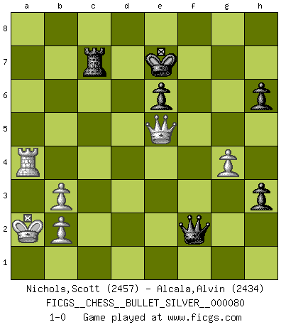 Last move : 1-0 2012 June 8 19:28:17 [Event "FICGS__CHESS__BULLET_SILVER__000080"] [Site "FICGS"] [Date "2012.06.08"] [Round "1"] [White "Nichols,Scott"] [Black "Alcala,Alvin"] [Result "1-0"] [WhiteElo "2457"] [BlackElo "2434"] 1.e4 c5 2.Nf3 d6 3.d4 cxd4 4.Nxd4 Nf6 5.Nc3 a6 6.Be3 e6 7.f3 b5 8.Qd2 Nbd7 9.g4 h6 10.O-O-O b4 11.Nce2 Qc7 12.Kb1 Bb7 13.Bg2 d5 14.exd5 Nxd5 15.Nf4 Nxe3 16.Qxe3 Nc5 17.Nh5 O-O-O 18.Nb3 Rxd1+ 19.Rxd1 g6 20.Nf4 Nxb3 21.axb3 Bd6 22.Nd3 g5 23.h4 gxh4 24.Qd2 a5 25.f4 Rd8 26.Rf1 Be7 27.f5 Bg5 28.Bxb7+ Kxb7 29.Qg2+ Ka7 30.fxe6 fxe6 31.Qf2+ Kb8 32.Qe2 Qd6 33.Ne5 Qd5 34.Qh2 Rc8 35.Nc4 Rc7 36.Rf8+ Kb7 37.Nd6+ Kc6 38.Ra8 a4 39.Ra6+ Kd7 40.Nb5 Qxb5 41.Qd6+ Kc8 42.Qf8+ Bd8 43.Ra8+ Kb7 44.Qxd8 Qf1+ 45.Ka2 axb3+ 46.cxb3 h3 47.Ra4 Kc6 48.Qe8+ Kd6 49.Qb8 Kd7 50.Qxb4 Qf2 51.Qb5+ Ke7 52.Qe5 1-0 Sicilian : Najdorf, Byrne (English) attack Queenside Castling by player White (move 10) Queenside Castling by player Black (move 17) Player White won this chess game. Follow this game move after move (download)Chess mastery essentially consists of analyzing Chess positions accurately. (Mikhail Botvinnik) Obwohl ich alt bin, darf mir niemand den Finger in den Mund stecken, sonst beisse ich. (Wilhelm Steinitz) Nunca antes ha habido un jugador de Ajedrez con tal conocimiento a fondo de las complejidades del juego y una inmensa voluntad absolutamente indomable de ganar. Yo pienso que Fischer es el jugador mas grande que jamás haya existido. (Lisa Lane) La vie est comme un jeu d'échecs : nous esquissons un plan, mais celui-ci est tributaire de ce que daignent faire l'adversaire aux échecs et le destin dans la vie. (Arthur Schopenhauer) We need strong personalities and only one world champion to attract sponsors. (Anatoly Karpov)