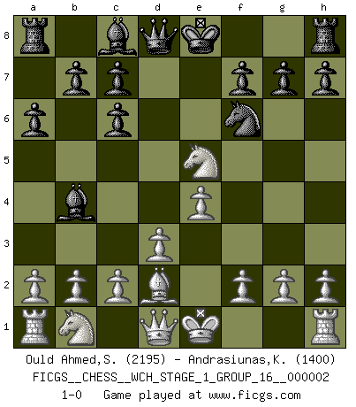 Last move : 1-0 2007 March 26 14:55:2 [Event "FICGS__CHESS__WCH_STAGE_1_GROUP_16__000002"] [Site "FICGS"] [Date "2007.01.16"] [Round "1"] [White "Ould Ahmed,Samy"] [Black "Andrasiunas,Kestutis"] [Result "1-0"] [WhiteElo "2195"] [BlackElo "1400"] 1.e4 Nc6 2.Nf3 e5 3.Bb5 Nf6 4.d3 a6 5.Bxc6 dxc6 6.Nxe5 Bb4+ 7.Bd2 1-0 This chess game has been lost on time (started : 2007.01.16 15:27:10) KP : Nimzovich defense Player White won this chess game. Follow this game move after move (download)If cunning alone were needed to excel, women would be the best Chess players. (Albin) Der Verteidiger gebe der Gewalt nach, aber nur der Gewalt. Er schaffe sich nicht freiwillig, etwa aus Blindheit oder aus Schrecken, irgendwelche Schwächen. Er lasse sich nicht bluffen. (Emanuel Lasker) El Ajedrez es el gimnasio de la mente. (Blaise Pascal) Il n'y a pas de prix trop élevé au scalp de l'ennemi. (Koblentz) The message for business people contemplating their place in the cyberspace is simple and direct: get linked or get lost. (Vic Sussman and Kenan Pollack)