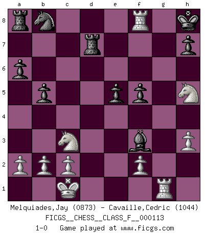 Last move : 1-0 2012 August 2 22:31:26 [Event "FICGS__CHESS__CLASS_F__000113"] [Site "FICGS"] [Date "2012.06.10"] [Round "1"] [White "Melquiades,Jay"] [Black "Cavaille,Cedric"] [Result "1-0"] [WhiteElo "0873"] [BlackElo "1044"] 1.e4 c5 2.Nf3 d6 3.Nc3 Nf6 4.h3 e6 5.d4 cxd4 6.Nxd4 Be7 7.Bg5 O-O 8.e5 dxe5 9.Nde2 Nd5 10.Bxe7 Nxe7 11.Qxd8 Rxd8 12.Ng3 a6 13.Bd3 b5 14.O-O-O Bb7 15.Nh5 Bxg2 16.Rhg1 Bf3 17.Rxg7+ Kh8 18.Rdg1 Nf5 19.Bxf5 exf5 20.Rxf7 Rd7 21.Rf8+ 1-0 Sicilian Kingside Castling by player Black (move 7) Queenside Castling by player White (move 14) Player White won this chess game. Follow this game move after move (download)We cannot resist the fascination of sacrifice, since a passion for sacrifices is part of a Chessplayer's nature. (Rudolf Spielman) Schach ist das schnellste Spiel der Welt, weil man in jeder Sekunde Tausende von Gedanken ordnen muß. (Albert Einstein) La caracteristica mas importante en la posición del Ajedrez es la actividad de las piezas. Esto es absolutamente fundamental en todas las fases del juego: Apertura, Juego Medio y especialmente Finales. La limitación primordial en la actividad de una pieza, es la estructuración de los Peones. (Michael Stean) Le pion, dans sa simplicité, marche droit devant lui, mais lorsqu'il prend, il le fait obliquement? Ainsi l'homme, tant qu'il reste pauvre, marche dans la droiture et vit honnêtement, mais lorsqu'il recherche les honneurs, il flatte, se parjure et, par les voies obliques, cherche une position supérieure sur l'échiquier du monde. (Jean de Galles) Art is the only way to run away without leaving home. (Twyla Tharp)