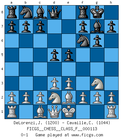 Last move : 0-1 2012 September 25 8:16:30 [Event "FICGS__CHESS__CLASS_F__000113"] [Site "FICGS"] [Date "2012.06.10"] [Round "1"] [White "DeLorenzi,Jose Raul"] [Black "Cavaille,Cedric"] [Result "0-1"] [WhiteElo "1200"] [BlackElo "1044"] 1.e3 g6 2.d3 Bg7 3.Ne2 d5 4.Ng3 Nf6 5.Be2 O-O 6.Nd2 e5 0-1 This chess game has been lost on time (started : 2012.06.10 3:39:53) Van't Kruijs Opening Kingside Castling by player Black (move 5) Player Black won this chess game. Follow this game move after move (download)It is always better to sacrifice your opponent's men. (Savielly Tartakower) Die Elozahlen sind sehr schlecht für das Schach. Jetzt ist Schach eine Sportindustrie, die darauf zielt Elopunkte zu machen. (Miguel Najdorf) Aquel que toma al Peón de Caballo de la Reina, se pasará la noche a dormir en la calle. (Anónimo) Les Cavaliers se révèlent fort utiles dans les positions fermées. D'habitude, les Fous sont un peu plus forts que les Cavaliers dans les positions ouvertes. Qu'on le veuille ou non, il restera toujours des exceptions ! Logic : The art of thinking and reasoning in strict accordance with the limitations and incapacities of the human misunderstanding. (Ambrose Bierce)
