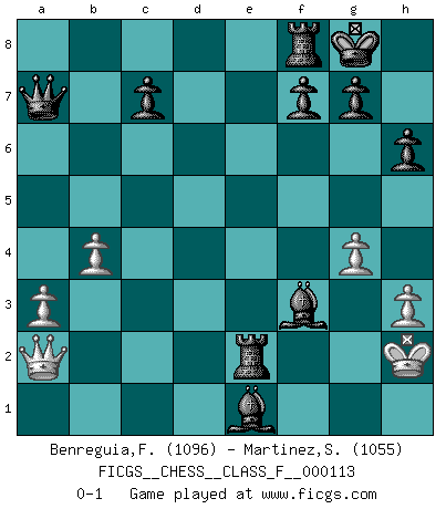 Last move : 0-1 2012 October 5 20:24:27 [Event "FICGS__CHESS__CLASS_F__000113"] [Site "FICGS"] [Date "2012.06.10"] [Round "1"] [White "Benreguia,Frederic"] [Black "Martinez,Silvio"] [Result "0-1"] [WhiteElo "1096"] [BlackElo "1055"] 1.b4 d5 2.d4 Nf6 3.c3 b5 4.e3 e6 5.Nf3 Bd6 6.Bxb5+ Bd7 7.Ba4 O-O 8.Nbd2 h6 9.a3 Ne4 10.O-O Nxc3 11.Qc2 Nxa4 12.e4 dxe4 13.Qxe4 Bc6 14.Qe2 Nd7 15.Nc4 Be7 16.Na5 Bd5 17.Qd3 Rb8 18.Ne5 Nxe5 19.Qc2 Qd7 20.Rb1 Ng6 21.f3 e5 22.g4 Nh4 23.dxe5 Nxf3+ 24.Rxf3 Bxf3 25.h3 Nb6 26.Be3 Qd5 27.Nc6 Rbe8 28.Nxa7 Qxe5 29.Qf2 Qe4 30.Re1 Qb7 31.Nb5 Nc4 32.Na7 Nxe3 33.Qxe3 Bh4 34.Qd2 Qxa7+ 35.Kh2 Bxe1 36.Qa2 Re2+ 0-1 Polish (Sokolsky) opening Kingside Castling by player Black (move 7) Kingside Castling by player White (move 10) Player Black won this chess game. Follow this game move after move (download)Pawn endings are to Chess what putting is to golf. (Cecil Purdy) Fischer: 'Remis!?' Uhlmann: 'Aber es muss doch dreimal Zugwiederholung sein!' Fischer: 'Sie nehmen das Remis an, wie ich es sage, sonst spiele ich weiter und werde Sie dann schlagen!' (Robert James Fischer) Personalmente, yo prefiero mirar hacia el futuro en donde un programa de computadora gane el título mundial de Ajedrez. La humanidad necesita una lección de humildad. (Richard Dawkings) Je ne crois pas en la psychologie, je crois aux bons coups. (Robert Fischer) Life doesn't imitate art, it imitates bad television. (Woody Allen)