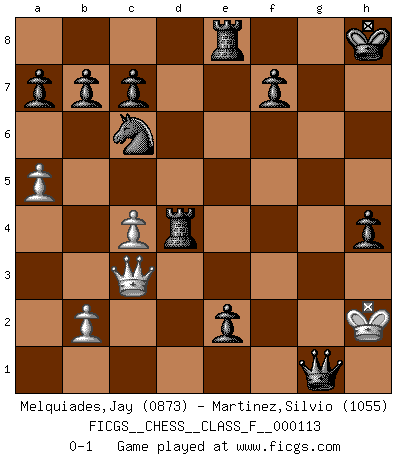 Last move : 0-1 2012 September 24 2:23:57 [Event "FICGS__CHESS__CLASS_F__000113"] [Site "FICGS"] [Date "2012.06.10"] [Round "1"] [White "Melquiades,Jay"] [Black "Martinez,Silvio"] [Result "0-1"] [WhiteElo "0873"] [BlackElo "1055"] 1.e4 Nc6 2.c3 e5 3.Nf3 Nf6 4.d3 Be7 5.h3 O-O 6.Bg5 h6 7.Bh4 d5 8.g4 Qd7 9.Nbd2 dxe4 10.Nxe4 Nxe4 11.Bxe7 Nxf2 12.Kxf2 Qxe7 13.h4 Bxg4 14.Rg1 Bh5 15.a4 Qf6 16.Be2 Rad8 17.Rg3 e4 18.d4 Rfe8 19.a5 e3 20.Kg2 Rd5 21.Ng5 Qf2+ 22.Kh3 Bxe2 23.Qb3 Qf5+ 24.Kh2 hxg5 25.Rag1 gxh4 26.Rxg7+ Kh8 27.c4 Rxd4 28.Qc3 Qf4+ 29.Kh1 Bf3+ 30.R7g2 Bxg2+ 31.Rxg2 Qf1+ 32.Kh2 e2 33.Rg1 Qxg1+ 0-1 KP : Nimzovich defense Kingside Castling by player Black (move 5) Player Black won this chess game. Follow this game move after move (download)The hardest game to win is a won game. (Emanuel Lasker) Karpov ist ein Museumsstück. (Garry Kasparov) Las piezas de Ajedrez son los bloques del alfabeto que moldean los pensamientos; y esos pensamientos, aunque hagan un diseño visual en el tablero, expresan abstractamente su belleza como un poema. (Marcel Duchamp) Le succès, c'est être capable d'aller d'échec en échec sans perdre son enthousiasme. (Winston Churchill) Wisdom doesn't necessarily come with age. Sometimes age just shows up all by itself. (Tom Wilson)