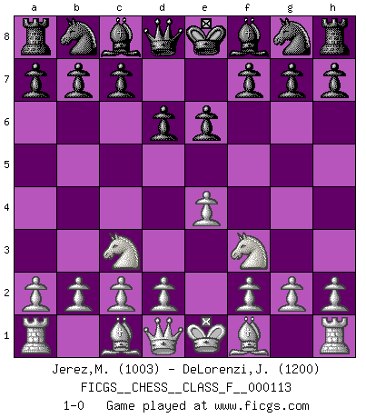 Last move : 1-0 2012 September 28 21:3:53 [Event "FICGS__CHESS__CLASS_F__000113"] [Site "FICGS"] [Date "2012.06.10"] [Round "1"] [White "Jerez,Miriam"] [Black "DeLorenzi,Jose Raul"] [Result "1-0"] [WhiteElo "1003"] [BlackElo "1200"] 1.e4 e6 2.Nc3 d6 3.Nf3 1-0 This chess game has been lost on time (started : 2012.06.10 3:39:53) French defense Player White won this chess game. Follow this game move after move (download)Adequate compensation for a sacrifice is having a sound combination leading to a winning position; adequate compensation for a blunder is having your opponent snatch defeat from the jaws of victory. (Bruce A. Moon) Irgendwie scheint mir sonntags früh um 9 Uhr der Killerinstinkt verloren gegangen zu sein. (Alexej Shirov) El Ajedrez es en su esencia, un juego. En su forma, un arte. Y en su ejecución, una ciencia. (Baron Tassilo) Dieu déplace le joueur, et celui-ci la pièce. Quel Dieu derrière Dieu commence donc la trame ? Arturo Perez-Reverte (prix de littérature policière 1993). I can't decide which is riskier; taking crazy risks, or taking advice on crazy risks from a crazy risk taker. (Gregory House in House M.D.)