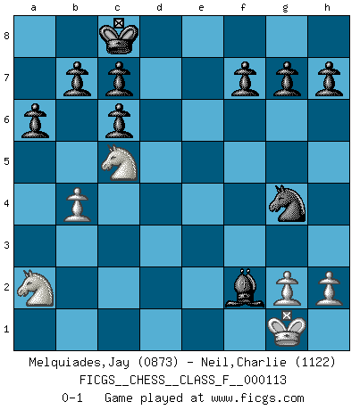 Last move : 0-1 2012 August 10 17:32:1 [Event "FICGS__CHESS__CLASS_F__000113"] [Site "FICGS"] [Date "2012.06.10"] [Round "1"] [White "Melquiades,Jay"] [Black "Neil,Charlie"] [Result "0-1"] [WhiteElo "0873"] [BlackElo "1122"] 1.e4 e5 2.Nf3 Nc6 3.Bb5 a6 4.Bxc6 dxc6 5.Nxe5 Qd4 6.Nd3 Qxe4+ 7.Qe2 Qxe2+ 8.Kxe2 Be6 9.Re1 Nf6 10.Nf4 Bf5 11.Nc3 O-O-O 12.Na4 Bxc2 13.b3 Bd6 14.d4 Rhe8+ 15.Kf1 Rxe1+ 16.Kxe1 Bb4+ 17.Bd2 Re8+ 18.Kf1 Bxd2 19.Nh3 Bd3+ 20.Kg1 Re1+ 21.Rxe1 Bxe1 22.Nc5 Bb1 23.Nf4 Bxa2 24.Nfd3 Bc3 25.b4 Bxd4 26.Nc1 Ng4 27.Nxa2 Bxf2+ 0-1 Ruy Lopez : Exchange variation Queenside Castling by player Black (move 11) Player Black won this chess game. Follow this game move after move (download)A thorough understanding of the typical mating continuations makes the most complicated sacrificial combinations leading up to them not only not difficult, but almost a matter of course. (Siegbert Tarrasch) Zum Sieg gelangt man nicht, wenn man gut, sondern nur wenn man besser spielt (Savielly Grigorievitsch Tartakower) Un jugador que trata de regresar una movida en el Ajedrez es un futuro carterista. (Richard Fenton) On peut tirer plus d'utilité d'une partie perdue que de 100 parties gagnées. (Capablanca) Those parts of the system that you can hit with a hammer (not advised) are called hardware; those program instructions that you can only curse at are called software. (Anonymous)