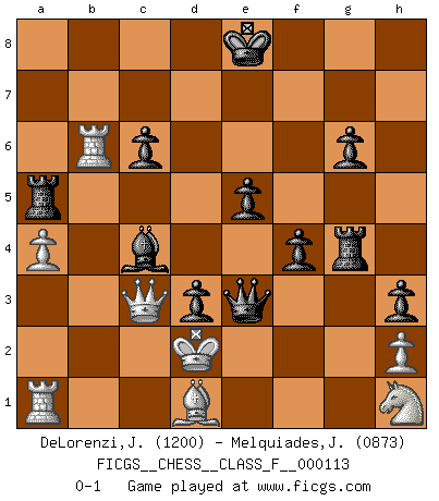 Last move : 0-1 2012 August 1 3:50:11 [Event "FICGS__CHESS__CLASS_F__000113"] [Site "FICGS"] [Date "2012.06.10"] [Round "1"] [White "DeLorenzi,Jose Raul"] [Black "Melquiades,Jay"] [Result "0-1"] [WhiteElo "1200"] [BlackElo "0873"] 1.e3 e5 2.d3 d5 3.Ne2 Nc6 4.Ng3 g6 5.Be2 d4 6.e4 Nf6 7.Nd2 Bb4 8.a3 Bxd2+ 9.Bxd2 Be6 10.b4 a5 11.bxa5 Nxa5 12.Bxa5 Rxa5 13.Qd2 b6 14.O-O h5 15.c4 Nd7 16.a4 Nc5 17.Qb2 h4 18.Nh1 h3 19.g3 f5 20.f3 f4 21.g4 Rh4 22.Bd1 Nxd3 23.Qc3 Nc5 24.Qc2 d3 25.Qc3 Qd6 26.Rf2 c6 27.Rb2 Nxe4 28.fxe4 Qc5+ 29.Kf1 Bxc4 30.Ke1 Qg1+ 31.Kd2 Qg2+ 32.Kc1 Qxe4 33.Kd2 Rxg4 34.Rxb6 Qe3+ 0-1 Van't Kruijs Opening Kingside Castling by player White (move 14) Player Black won this chess game. Follow this game move after move (download)He who fears an isolated Queen's Pawn should give up Chess. (Siegbert Tarrasch) Wie, soll nun auch die Opposition abgeschafft werden? Ja, es tut mir leid, Ihnen diesen Schmerz nicht ersparen zu können. (Aaron Nimzowitsch) No hay precio que sea tan grande por la cabellera del Rey enemigo. (Koblentz) Il s'avisa de me proposer d'apprendre les échecs qu'il jouait un peu... me voilà forcené des échecs. J'achète un échiquier, je m'enferme dans ma chambre, j'y passe des jours et des nuits à vouloir apprendre par cur toutes les parties. (Jean-Jacques Rousseau, Confessions) Watch your thoughts; they become words. Watch your words; they become actions. Watch your actions; they become habits. Watch your habits; they become character. Watch your character; it becomes your destiny. (Frank Outlaw)