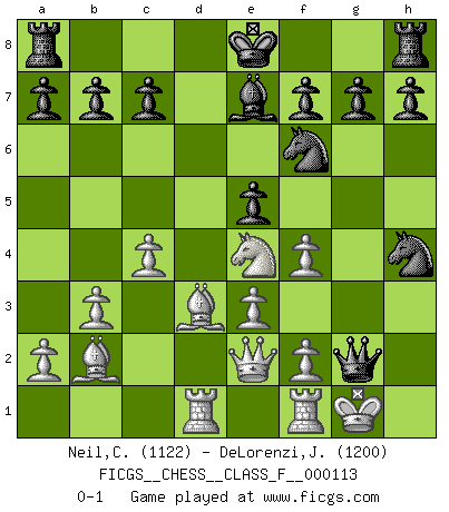 Last move : 0-1 2012 August 24 17:8:1 [Event "FICGS__CHESS__CLASS_F__000113"] [Site "FICGS"] [Date "2012.06.10"] [Round "1"] [White "Neil,Charlie"] [Black "DeLorenzi,Jose Raul"] [Result "0-1"] [WhiteElo "1122"] [BlackElo "1200"] 1.d4 e6 2.c4 d6 3.Nc3 Ne7 4.Nf3 Ng6 5.e3 Be7 6.Bd3 Nd7 7.O-O Nf6 8.b3 Bd7 9.Bb2 e5 10.dxe5 dxe5 11.Qe2 Bg4 12.h3 Bxf3 13.gxf3 Qd7 14.Rad1 Qxh3 15.Ne4 Nh4 16.f4 Qg2+ 0-1 Queen's pawn Kingside Castling by player White (move 7) Player Black won this chess game. Follow this game move after move (download)Becoming successful at Chess allows you to discover your own personality. That's what I want for the kids I teach. (Saudin Robovic) Wie kann ich Remis annehmen? Ich weiß ja gar nicht, wie ich stehe! (Fritz Sämisch) Yo tuve un dolor de muelas en la primer partida. En el segundo juego, tuve un dolor de cabeza. En el tercero, tuve un ataque de reumatísmo. En la cuarta partida, no me sentía muy bien. ¿Y en el quinto juego? Bueno, ¿que acaso uno tiene que ganar todos los juegos?. (Siegbert Tarrasch) D'abord les bases : Jouez et étudiez, puis étudiez et jouez, ensuite jouez et étudiez, puis étudiez et jouez. Deuxièmement : Donnez toujours le meilleur de vous-même ! (Ken Smith) To err is human, to shift the blame on someone else is tactical. (Mladen Jankovic)