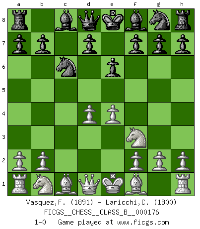 Last move : 1-0 2012 September 23 8:7:22 [Event "FICGS__CHESS__CLASS_B__000176"] [Site "FICGS"] [Date "2012.06.10"] [Round "1"] [White "Vasquez,Fernando"] [Black "Laricchi,Claudio"] [Result "1-0"] [WhiteElo "1891"] [BlackElo "1800"] 1.e4 c5 2.d4 cxd4 3.c3 Nc6 4.cxd4 e6 5.Nf3 1-0 This chess game has been lost on time (started : 2012.06.10 13:7:52) Sicilian : Smith-Morra gambit Player White won this chess game. Follow this game move after move (download)All my games are real. (Bobby Fischer) Computer sind die einzigen Gegner, die nicht immer eine Ausrede auf Lager haben, wenn sie gegen mich verlieren. (Robert James Fischer) Ciertamente el estado mental actual de Bobby Fischer es una tragedia. Uno de los mas grandes jugadores de Ajedrez del mundo -el orgullo y pena del Ajedrez Americano. (Frank Brady) Les échecs, c'est la lutte contre l'erreur. (Johannes Zukertort) The smarter you play, the luckier you'll be. (Mark Pilarski)