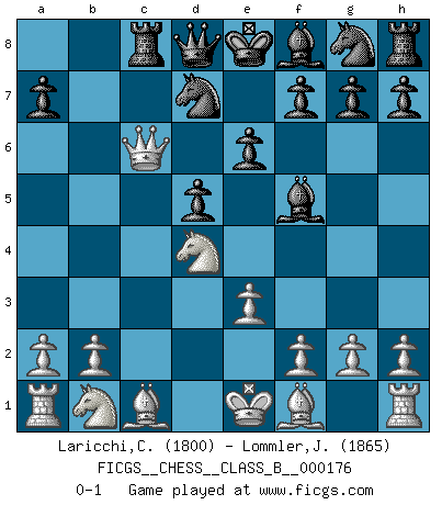Last move : 0-1 2012 September 20 19:47:9 [Event "FICGS__CHESS__CLASS_B__000176"] [Site "FICGS"] [Date "2012.06.10"] [Round "1"] [White "Laricchi,Claudio"] [Black "Lommler,Jan Peter"] [Result "0-1"] [WhiteElo "1800"] [BlackElo "1865"] 1.d4 d5 2.c4 c6 3.e3 Bf5 4.Nf3 e6 5.c5 b6 6.Qb3 bxc5 7.Qb7 Nd7 8.Qxc6 cxd4 9.Nxd4 Rc8 0-1 This chess game has been lost on time (started : 2012.06.10 13:7:52) QGD Slav defense Player Black won this chess game. Follow this game move after move (download)Half the variations which are calculated in a tournament game turn out to be completely superfluous. Unfortunately, no one knows in advance which half. (Jan Tinman) Ein Schachgenie ist jemand der verdammt gut Schach spielt. (Jonathan Levitt) Hoy en día, si tu no eres un Gran Maestro a los 14 años, es mejor que lo olvides. (Anand Viswanathan) Le pion, dans sa simplicité, marche droit devant lui, mais lorsqu'il prend, il le fait obliquement? Ainsi l'homme, tant qu'il reste pauvre, marche dans la droiture et vit honnêtement, mais lorsqu'il recherche les honneurs, il flatte, se parjure et, par les voies obliques, cherche une position supérieure sur l'échiquier du monde. (Jean de Galles) I take risks, sometimes patients die, but not taking risks causes more patients to die. So I guess my biggest problem is I've been cursed with the ability to do the math. (Gregory House, House M.D.)