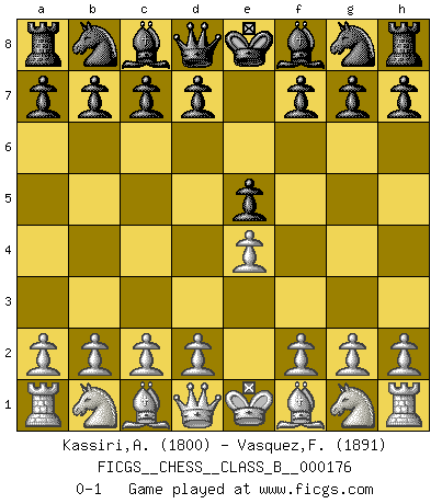 Last move : 0-1 2012 September 20 19:47:9 [Event "FICGS__CHESS__CLASS_B__000176"] [Site "FICGS"] [Date "2012.06.10"] [Round "1"] [White "Kassiri,Abdessamad"] [Black "Vasquez,Fernando"] [Result "0-1"] [WhiteElo "1800"] [BlackElo "1891"] 1.e4 e5 0-1 This chess game has been lost on time (started : 2012.06.10 13:7:52) King's pawn game Player Black won this chess game. Follow this game move after move (download)Could we look into the head of a Chess player, we should see there a whole world of feelings, images, ideas, emotion and passion. (Alfred Binet) Matt entspricht nicht immer den Tatsachen. (Savielly Grigorievitsch Tartakower) Cada Peón es potencialmente una Reina. (James Mason) Même si l'adversaire joue le coup analysé précédemment, recommencez l'analyse en voyant la nouvelle position. Première règle de Blumenfeld However beautiful the strategy, you should occasionally look at the results. (Winston Churchill)