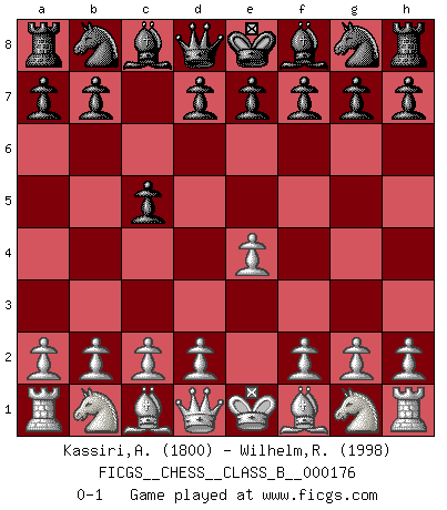 Last move : 0-1 2012 September 20 19:47:9 [Event "FICGS__CHESS__CLASS_B__000176"] [Site "FICGS"] [Date "2012.06.10"] [Round "1"] [White "Kassiri,Abdessamad"] [Black "Wilhelm,Robert"] [Result "0-1"] [WhiteElo "1800"] [BlackElo "1998"] 1.e4 c5 0-1 This chess game has been lost on time (started : 2012.06.10 13:7:52) Sicilian defense Player Black won this chess game. Follow this game move after move (download)Combinations have always been the most intriguing aspect of Chess. The masters look for them, the public applauds them, the critics praise them. It is because combinations are possible that Chess is more than a lifeless mathematical exercise. They are the poetry of the game; they are to Chess what melody is to music. They represent the triumph of mind over matter. (Reuben Fine) Dein Körper muss in Topform sein. Dein Schach verfällt, wenn dein Körper verfällt. Der Körper kann nicht vom Geist getrennt werden. (Robert James Fischer) La belleza de un movimiento no se refleja solo en su apariencia, sino en el pensamiento detrás de él. (Siegbert Tarrasch) Les Echecs mettent en conflit, non pas deux intelligences, mais deux volontés. (Lasker) The difference between stupidity and genius is that genius has its limits. (Murphy)