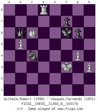 Last move : 1-0 2014 January 26 18:7:30 [Event "FICGS__CHESS__CLASS_B__000176"] [Site "FICGS"] [Date "2012.06.10"] [Round "1"] [White "Wilhelm,Robert"] [Black "Vasquez,Fernando"] [Result "1-0"] [WhiteElo "1998"] [BlackElo "1891"] 1.e4 d5 2.exd5 Qxd5 3.Nc3 Qd6 4.g3 Nc6 5.Bg2 Nf6 6.d3 Bg4 7.Nge2 e5 8.h3 Be6 9.f4 O-O-O 10.fxe5 Nxe5 11.O-O Qb6+ 12.Kh1 Ng6 13.a4 a5 14.Qe1 h5 15.Nb5 c6 16.Bd2 Bb4 17.c3 Bd6 18.c4 cxb5 19.Bxa5 Qe3 20.Rf3 Qh6 21.axb5 Ne5 22.Qf2 h4 23.g4 Qg5 24.Bxd8 Rxd8 25.Qd4 Kd7 26.R3f1 Ke8 27.Nf4 Ng6 28.Nxg6 Bg3 29.Qc3 Qxg6 30.d4 Kf8 31.d5 Bc8 32.Ra8 Qg5 33.b4 Kg8 34.Qd3 Rf8 35.c5 b6 36.d6 bxc5 37.b6 c4 38.Qxc4 Bxd6 39.Qd4 Be5 40.Qd3 g6 41.b7 Be6 42.Rxf8+ Kxf8 43.Qd8+ Kg7 44.b8Q Bxb8 45.Qxb8 Bd5 46.Qd8 Bc4 47.Rd1 Kh7 48.Qd4 Bb5 49.Qf2 Qe5 50.Qxh4+ Kg8 51.Qe1 Qc7 52.Rc1 Qb8 53.Qf2 Ne8 54.Bd5 Nd6 55.Qf6 Bd3 56.Qd4 Ba6 57.Qe5 Bb7 58.Rd1 Ba8 59.Rd4 Qb5 60.Kg1 Qb6 61.Kg2 Bxd5+ 62.Rxd5 Nc4 63.Qe8+ Kg7 64.Rd8 Kf6 65.b5 Ne3+ 66.Kf3 Nc4 67.Qc6+ 1-0 Scandinavian : Pytel-Wade variation Queenside Castling by player Black (move 9) Kingside Castling by player White (move 11) Promotion Queen by player White (move 44) Player White won this chess game. Follow this game move after move (download)I'd rather have a Pawn than a finger. (Reuben Fine) Obwohl ich alt bin, darf mir niemand den Finger in den Mund stecken, sonst beisse ich. (Wilhelm Steinitz) Yo tuve un dolor de muelas en la primer partida. En el segundo juego, tuve un dolor de cabeza. En el tercero, tuve un ataque de reumatísmo. En la cuarta partida, no me sentía muy bien. ¿Y en el quinto juego? Bueno, ¿que acaso uno tiene que ganar todos los juegos?. (Siegbert Tarrasch) Les échecs sont utiles à l'exercice de la faculté de penser et à celle de l'imagination. Car nous devons posséder une méthode élaborée pour atteindre des buts partout où nous devons conduire notre raison. (Leibnitz) A specialist learns more and more about less and less until he knows everything about nothing. (Nicholas Murray Butler)