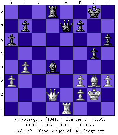 Last move : 1/2-1/2 2013 February 3 23:58:40 [Event "FICGS__CHESS__CLASS_B__000176"] [Site "FICGS"] [Date "2012.06.10"] [Round "1"] [White "Krakovsky,Peter"] [Black "Lommler,Jan Peter"] [Result "1/2-1/2"] [WhiteElo "1841"] [BlackElo "1865"] 1.c4 c5 2.Nf3 Nf6 3.e3 e6 4.d4 d5 5.Nc3 a6 6.cxd5 exd5 7.dxc5 Bxc5 8.Bd3 O-O 9.O-O Nc6 10.h3 Re8 11.a3 d4 12.exd4 Nxd4 13.Bg5 Be6 14.b4 Ba7 15.Nxd4 Bxd4 16.Rc1 h6 17.Bh4 Rc8 18.Ne4 Rxc1 19.Qxc1 g5 20.Bg3 Nxe4 21.Bxe4 Qd7 22.Bf3 Bd5 23.Rd1 Bxf3 24.gxf3 Rc8 25.Qd2 Rd8 26.Kg2 Qe7 27.Re1 1/2-1/2 English : Symmetrical variation Kingside Castling by player Black (move 8) Kingside Castling by player White (move 9) This chess game ended in a draw. Follow this game move after move (download)What would Chess be without silly mistakes ? (Kurt Richter) Ich verstehe mehr vom Schach als irgendein anderer lebender Meister. (José Raúl Capablanca) Fischer no está bajo la obligación de nadie. (Joseph Platz) Les pièces de l'échiquier étaient impitoyables. Elles le retenaient, elles l'absorbaient. Il y avait de l'horreur en cela, mais aussi une harmonie unique. Car, qu'y a-t-il dans le monde, à part les échecs ? (V. Nabokov) Kids, you tried your best and you failed miserably. The lesson is, never try. (Simpsons)