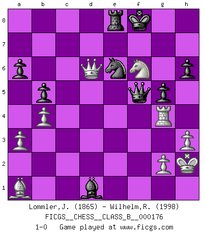 Last move : 1-0 2012 December 18 7:6:13 [Event "FICGS__CHESS__CLASS_B__000176"] [Site "FICGS"] [Date "2012.06.10"] [Round "1"] [White "Lommler,Jan Peter"] [Black "Wilhelm,Robert"] [Result "1-0"] [WhiteElo "1865"] [BlackElo "1998"] 1.e4 c5 2.c3 Nf6 3.e5 Nd5 4.d4 cxd4 5.Nf3 e6 6.cxd4 b6 7.Bc4 Bb7 8.O-O Be7 9.Bxd5 Bxd5 10.Nc3 Bc4 11.Re1 O-O 12.b3 Ba6 13.d5 Bb4 14.Qd4 Bxc3 15.Qxc3 Bb7 16.Ba3 Re8 17.dxe6 dxe6 18.Rad1 Nd7 19.Qe3 Rc8 20.Nd4 a6 21.Rd2 Qc7 22.Bd6 Qc3 23.Rd3 Qa5 24.a3 Ba8 25.b4 Qd5 26.f3 Qc4 27.Ne2 Qh4 28.Red1 h6 29.Rd4 Qh5 30.Rg4 Qf5 31.Nd4 Qh7 32.h3 b5 33.Ne2 Bd5 34.Kh2 Bc4 35.Ng3 f5 36.exf6 Nxf6 37.Rgd4 Rc6 38.Be5 Nd5 39.Qe1 Bb3 40.R1d2 Rec8 41.Rg4 g5 42.f4 Rc4 43.Bd4 Nxf4 44.Qe3 e5 45.Bxe5 Re8 46.Qb6 Qg6 47.Rd6 Ne6 48.Nh5 Qf5 49.Ba1 Rc1 50.Nf6+ Kf8 51.Rd7 Rd1 52.Rxd1 Bxd1 53.Qd6+ 1-0 Sicilian : Alapin's variation (2.c3) Kingside Castling by player White (move 8) Kingside Castling by player Black (move 11) Player White won this chess game. Follow this game move after move (download)I played Chess with him and would have beaten him sometimes only he always took back his last move, and ran the game out differently. (Mark Twain) Das Schachspiel übertrifft alle anderen Spiele so weit wie der Chimborasso einen Misthaufen. (Arthur Schopenhauer) Siempre es mejor sacrificar los hombres de tu oponente. (Savielly Tartakower) Votre seul travail dans les ouvertures est d'obtenir un milieu de partie jouable. (Lajos Portish) An expert is a man who has made all the mistakes which can be made in a very narrow field. (Niels Bohr)