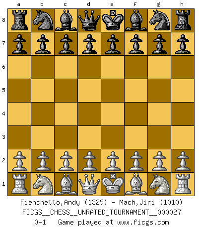 Last move : 0-1 2012 September 6 5:19:7 [Event "FICGS__CHESS__UNRATED_TOURNAMENT__000027"] [Site "FICGS"] [Date "2012.07.28"] [Round "1"] [White "Fienchetto,Andy"] [Black "Mach,Jiri"] [Result "0-1"] [WhiteElo "1329"] [BlackElo "1010"] 0-1 This chess game has been lost on time (started : 2012.07.28 4:7:6) Player Black won this chess game. Follow this game move after move (download)It is difficult to play against Einstein's theory --on his first loss to Fischer. (Mikhail Tal) Ich verstehe den Grund nicht, warum die Aufteilung in Frauen und Männer überhaupt im Schach besteht. (Judith Polgar) Bobby es la celebridad menos entendida y malinterpretada que camina el la faz de esta tierra. (Yasser Seirawan) Ce qui caractérise les parties de combat, c'est que si le défenseur a constamment de difficiles problèmes à résoudre, l'attaquant doit chercher sans relâche de nouvelles possibilités d'attaque. (Koblentz) The large trees attract high winds. (Chinese proverb)
