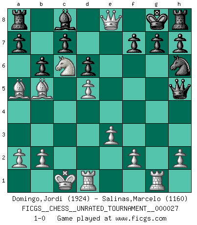 Last move : 1-0 2012 July 30 17:32:25 [Event "FICGS__CHESS__UNRATED_TOURNAMENT__000027"] [Site "FICGS"] [Date "2012.07.28"] [Round "1"] [White "Domingo,Jordi"] [Black "Salinas,Marcelo"] [Result "1-0"] [WhiteElo "1924"] [BlackElo "1160"] 1.g4 Nc6 2.d4 e5 3.d5 Nd4 4.e3 Nxc2+ 5.Qxc2 Bb4+ 6.Bd2 Qe7 7.Nc3 Bxc3 8.Bxc3 Nh6 9.g5 Qxg5 10.Nf3 Qg4 11.Nxe5 Qg5 12.O-O-O d6 13.Bb5+ Kd8 14.Rhg1 Qh5 15.Ba5 b6 16.Nc6+ Ke8 17.Qe4+ Kf8 18.Qe7+ Kg8 19.Qe8+ 1-0 Grob's attack Queenside Castling by player White (move 12) Player White won this chess game. Follow this game move after move (download)By the beauty of his games, the clarity of his play, and the brilliance of his ideas, Fischer made himself an artist of the same stature as Brahms, Rembrandt, and Shakespeare. (David Levy) Wie kann ich Remis annehmen? Ich weiß ja gar nicht, wie ich stehe! (Fritz Sämisch) Yo creo que el Ajedrez posee una magia que es también una ayuda en la edad avanzada. Una rodilla reumática es olvidada durante una partida de Ajedrez y otros eventos pueden parecer algo sin importancia comparada a una catástrofe en el tablero de Ajedrez. (Vlastimil Hort) On a dit que l'homme se distingue de l'animal par le fait qu'il achète plus de livres qu'il ne peut en lire. Je voudrais suggérer qu'inclure à la liste des livres quelques livres d'échecs rendrait la distinction manifeste. (Edward Lasker) Now you put water in a cup, it becomes the cup; You put water into a bottle it becomes the bottle; You put it in a teapot it becomes the teapot. Water can flow or it can crash. Be water, my friend. (Bruce Lee)