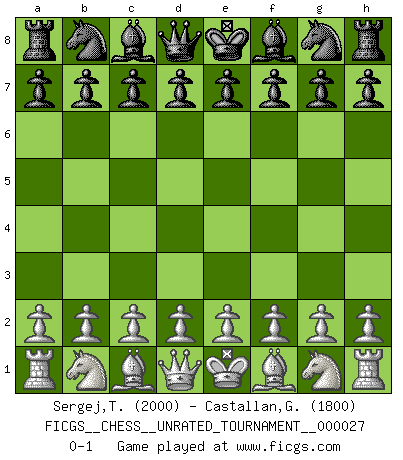 Last move : 0-1 2012 September 6 5:19:7 [Event "FICGS__CHESS__UNRATED_TOURNAMENT__000027"] [Site "FICGS"] [Date "2012.07.28"] [Round "1"] [White "Sergej,Thigorin"] [Black "Castallan,Gerald"] [Result "0-1"] [WhiteElo "2000"] [BlackElo "1800"] 0-1 This chess game has been lost on time (started : 2012.07.28 4:7:6) Player Black won this chess game. Follow this game move after move (download)Chess is a part of culture and if a culture is declining then Chess too will decline. (Mikhail Botvinnik) Bis jetzt ist Weiß einer wohlbekannten Analyse gefolgt. Aber jetzt begeht er einen schrecklichen Fehler: Er beginnt seinen eigenen Kopf zu benutzen. (Siegbert Tarrasch) Un mal día en el Ajedrez, es mejor que cualquier buen día en el trabajo. (Anonymous) L'attaque fait le spectacle, la défense gagne les matchs. (Dicton footballistique) Hold em is to stud what chess is to checkers. (Johnny Moss)