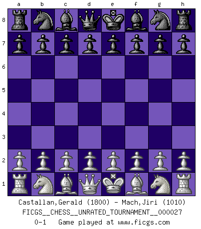 Last move : 0-1 2012 September 6 5:19:7 [Event "FICGS__CHESS__UNRATED_TOURNAMENT__000027"] [Site "FICGS"] [Date "2012.07.28"] [Round "1"] [White "Castallan,Gerald"] [Black "Mach,Jiri"] [Result "0-1"] [WhiteElo "1800"] [BlackElo "1010"] 0-1 This chess game has been lost on time (started : 2012.07.28 4:7:6) Player Black won this chess game. Follow this game move after move (download)The enormous mental resilience, without which no Chess player can exist, was so much taken up by Chess that he could never free his mind of this game. (Albert Einstein) Ein Gewinn durch eine ungenaue Kombination, sei sie auch noch so vorzeigbar, erfüllt mich mit Schaudern. (Wilhelm Steinitz) El jugador blanco perdió porque fallo en recordar la coreccta continuación y tuvo que pensar por sí mismo las movidas. (Siegbert Tarrasch) Votre seul travail dans les ouvertures est d'obtenir un milieu de partie jouable. (Lajos Portish) The beginning is the most important part of the work. (Plato)