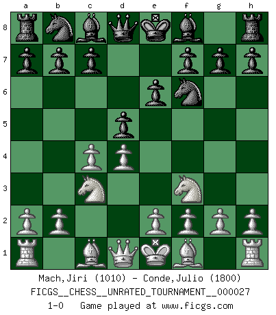 Last move : 1-0 2012 September 30 9:6:12 [Event "FICGS__CHESS__UNRATED_TOURNAMENT__000027"] [Site "FICGS"] [Date "2012.07.28"] [Round "1"] [White "Mach,Jiri"] [Black "Conde,Julio"] [Result "1-0"] [WhiteElo "1010"] [BlackElo "1800"] 1.d4 Nf6 2.c4 e6 3.Nc3 d5 4.Nf3 1-0 This chess game has been lost on time (started : 2012.07.28 4:7:6) Queen's pawn game Player White won this chess game. Follow this game move after move (download)Chess is a fighting game which is purely intellectual and includes chance. (Richard Reti) Ich rechne überhaupt nicht voraus. Ich gewinne auch so. (Robert James Fischer) A través de las casillas del tablero, los Indios explican el movimiento del tiempo y la edad, las influencias mas altas que controlan el mundo y los lazos que vinculan al Ajedrez con el alma humana. (Al-Masudi) La solitude du joueur d'Echecs à l'approche du mat est semblable à celle du condamné. (Francis Szpiner) The right perception of any matter and a misunderstanding of the same matter do not wholly exclude each other. (Kafka's the trial)