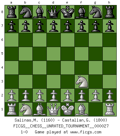 Last move : 1-0 2012 September 6 17:20:11 [Event "FICGS__CHESS__UNRATED_TOURNAMENT__000027"] [Site "FICGS"] [Date "2012.07.28"] [Round "1"] [White "Salinas,Marcelo"] [Black "Castallan,Gerald"] [Result "1-0"] [WhiteElo "1160"] [BlackElo "1800"] 1.Nf3 1-0 This chess game has been lost on time (started : 2012.07.28 4:7:6) Reti Opening Player White won this chess game. Follow this game move after move (download)Chess is a terrible game. If you have no center, your opponent has a freer position. If you do have a center, then you really have something to worry about ! (Siegbert Tarrasch) Die meiste Zeit treffe ich auf Gegner, die meine Enkel sein könnten. Ich bin da, um ihnen zu zeigen, dass sie von mir noch einiges lernen können. (Viktor Kortschnoi) Un mal plan es mejor que no tener ningún plan. (Frank Marshall) Les échecs c'est le défi de l'alpiniste, toujours plus haut, prêt à tout pour monter à l'assaut du Roi ennemi. Les échecs, c'est de la musique en mouvement, un ballet majestueux pour les yeux. C'est de la poésie composée par les fantômes du passé qui au même titre que Rimbaud ou Verlaine méritent notre admiration. Les échecs, c'est de la peinture ou le moindre mouvement modifie le tableau pour en faire un Picasso ou un Van Gogh. Les échecs, c'est tout et rien, c'est la vie et la mort. Jjulie33 sur le forum de France-Echecs. Computers have lots of memory but no imagination. (Anonymous)