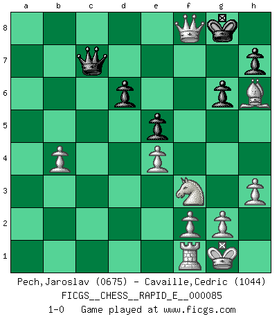 Last move : 1-0 2012 October 2 16:40:25 [Event "FICGS__CHESS__RAPID_E__000085"] [Site "FICGS"] [Date "2012.07.28"] [Round "1"] [White "Pech,Jaroslav"] [Black "Cavaille,Cedric"] [Result "1-0"] [WhiteElo "0675"] [BlackElo "1044"] 1.c4 g6 2.Nc3 Bg7 3.d4 d6 4.e4 e5 5.d5 Nf6 6.h3 O-O 7.Nf3 c6 8.Bg5 a6 9.Bd3 Nbd7 10.O-O Rb8 11.a3 b5 12.dxc6 Nb6 13.cxb5 axb5 14.Qc2 Ba6 15.a4 Nc4 16.axb5 Bxb5 17.Nxb5 Rxb5 18.Bxc4 Rc5 19.b4 Rxc6 20.Bxf7+ Rxf7 21.Qxc6 Qc7 22.Ra8+ Bf8 23.Rxf8+ Kxf8 24.Bh6+ Kg8 25.Qa8+ Ne8 26.Qxe8+ Rf8 27.Qxf8+ 1-0 English Opening Kingside Castling by player Black (move 6) Kingside Castling by player White (move 10) Player White won this chess game. Follow this game move after move (download)Morphy was probably the greatest genius of them all. (Bobby Fischer) Wie gewinnt Tal? Er entwickelt alle seine Figuren in die Brettmitte und opfert sie dann irgendwo. (Robert James Fischer) En el Ajedrez, tal como es jugado por los Maestros, practicamente la suerte es eliminada. (Emanuel Lasker) Je menace de comprendre la position. (Anonyme) I can't decide which is riskier; taking crazy risks, or taking advice on crazy risks from a crazy risk taker. (Gregory House in House M.D.)