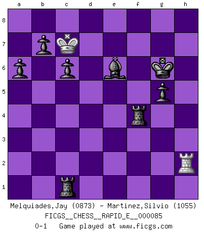 Last move : 0-1 2012 October 10 3:1:49 [Event "FICGS__CHESS__RAPID_E__000085"] [Site "FICGS"] [Date "2012.07.28"] [Round "1"] [White "Melquiades,Jay"] [Black "Martinez,Silvio"] [Result "0-1"] [WhiteElo "0873"] [BlackElo "1055"] 1.e4 Nc6 2.c3 e5 3.Nf3 Nf6 4.h3 d5 5.d3 dxe4 6.dxe4 Nxe4 7.Nbd2 Nxd2 8.Bxd2 Be7 9.Qa4 O-O 10.Bb5 Bd7 11.Nxe5 Be6 12.O-O-O Nxe5 13.Rhe1 Nd3+ 14.Bxd3 Qxd3 15.Be3 Qf5 16.g4 Qf3 17.Bd4 a6 18.Bxg7 Kxg7 19.Qd4+ Bf6 20.Rd3 Bxd4 21.Rxf3 Bc5 22.b4 Bd5 23.Rf5 c6 24.bxc5 Bxa2 25.Rg5+ Kf6 26.Rh5 Kg6 27.f4 f5 28.Rg5+ Kf6 29.h4 Rae8 30.Rxf5+ Kg7 31.Rg5+ Kh8 32.Rh1 Rxf4 33.Kb2 Re2+ 34.Ka3 Rc4 35.Rf1 Rxc3+ 36.Ka4 h6 37.Rf8+ Kh7 38.Rh5 Kg6 39.Rg8+ Bxg8 40.Rf5 Re4+ 41.Ka5 Be6 42.h5+ Kg7 43.Rf2 Rxc5+ 44.Kb6 Rc1 45.g5 hxg5 46.Rh2 Rb4+ 47.Kc7 Rh4 48.h6+ Kxh6 49.Rd2 Rf4 50.Rh2+ Kg6 0-1 KP : Nimzovich defense Kingside Castling by player Black (move 9) Queenside Castling by player White (move 12) 10 pieces endgame at move 48 : White KR , Black KRRBPPPP WHITE : King + 1 Rook BLACK : King + 2 Rooks 1 Bishop 4 Pawns Player Black won this chess game. Follow this game move after move (download)When asked, -How is that you pick better moves than your opponents?, I responded: I'm very glad you asked me that, because, as it happens, there is a very simple answer. I think up my own moves, and I make my opponent think up his. (Alexander Alekhine) Modernes Schach sorgt sich zuviel um Dinge wie Bauernstruktur usw. Vergessen Sie das, Schachmatt beendet das Spiel! (Nigel Short) Al jugar al Ajedrez entonces, podemos aprender: Primero: Previsión... Segundo: Prudencia... Tercero: Cautela... Y al final, aprendemos del Ajedrez el hábito de no ser desanimados por apariencias malas presentes en el estado de nuestros asuntos, el hábito de la esperanza por una oportunidad favorable y la perseveración de los secretos de los recursos. (Benjamin Franklin) A ce moment-là, je menaçais de comprendre la position ! (Clément L'Heureux) The only difference between a tax man and a taxidermist is that the taxidermist leaves the skin. (Mark Twain)