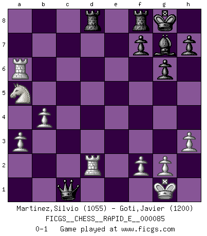 Last move : 0-1 2012 November 10 10:26:11 [Event "FICGS__CHESS__RAPID_E__000085"] [Site "FICGS"] [Date "2012.07.28"] [Round "1"] [White "Martinez,Silvio"] [Black "Goti,Javier"] [Result "0-1"] [WhiteElo "1055"] [BlackElo "1200"] 1.e4 c5 2.Na3 Nc6 3.Nf3 g6 4.b3 Bg7 5.Rb1 a6 6.Bc4 e6 7.O-O d5 8.exd5 exd5 9.Be2 Nge7 10.d4 b6 11.dxc5 bxc5 12.Bb2 d4 13.Nc4 O-O 14.h3 Nb4 15.a3 Na2 16.Qd3 Nc3 17.Bxc3 dxc3 18.Rbd1 Qxd3 19.Rxd3 Nc6 20.Re1 Bf5 21.Rd6 Nd4 22.Nxd4 cxd4 23.Na5 Bxc2 24.b4 Rad8 25.Rxa6 d3 26.Bd1 d2 27.Rf1 Bxd1 28.Rxd1 c2 29.Rxd2 c1Q+ 0-1 This chess game has been lost on time (started : 2012.07.28 8:4:0) Sicilian defense Kingside Castling by player White (move 7) Kingside Castling by player Black (move 13) Promotion Queen by player Black (move 29) Player Black won this chess game. Follow this game move after move (download)Of all my Russian books, the defense contains and diffuses the greatest 'warmth' which may seem odd seeing how supremely abstract Chess is supposed to be. (Vladimir Nabokov) Die westlichen Werte sind eine Sprache, welche die Putin-Administration nicht versteht. (Garry Kasparov) Con el fin de mejorar tu juego, debes de estudiar los finales antes que todo, ya que mientras que los finales pueden ser estudiados y dominados por sí mismos, el juegomedio y la apertura deben de ser estudiados en relación con los finales. (José Raúl Capablanca) Plusieurs personnes se sont demandées comment Tal faisait pour gagner... En fait, c'est très simple ! Il met ses pièces au centre de l'échiquier et les sacrifie quelque part ! (David Bronstein) Home computers are being called upon to perform many new functions, including the consumption of homework formerly eaten by the dog. (Doug Larson)