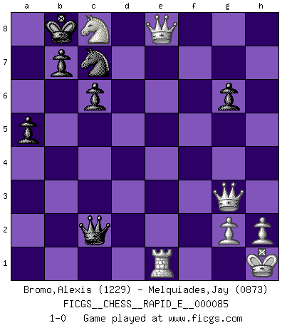 Last move : 1-0 2012 August 4 18:44:46 [Event "FICGS__CHESS__RAPID_E__000085"] [Site "FICGS"] [Date "2012.07.28"] [Round "1"] [White "Bromo,Alexis"] [Black "Melquiades,Jay"] [Result "1-0"] [WhiteElo "1229"] [BlackElo "0873"] 1.d4 d5 2.c4 dxc4 3.Nc3 c6 4.e4 h5 5.Bxc4 e6 6.Nf3 f6 7.Bf4 Bd6 8.Bxd6 Qxd6 9.e5 fxe5 10.dxe5 Qb4 11.Bb3 a5 12.a4 Ne7 13.Ng5 Na6 14.Nxe6 Bxe6 15.Bxe6 Rd8 16.Qf3 Rf8 17.Qxh5+ g6 18.Qg5 Qxb2 19.O-O Rd2 20.Ne4 Re2 21.Nd6+ Kd8 22.Rad1 R8xf2 23.Nc8 Kc7 24.Qxe7+ Kb8 25.Qd6+ Nc7 26.Rxf2 Rxf2 27.Bh3 Rc2 28.e6 Re2 29.e7 Qh8 30.Rb1 Qh4 31.Qg3 Qxa4 32.Bg4 Qd4+ 33.Kh1 Qe4 34.Rd1 Qc2 35.Bxe2 Qxe2 36.Re1 Qc2 37.e8Q 1-0 Queen's gambit accepted Kingside Castling by player White (move 19) Promotion Queen by player White (move 37) Player White won this chess game. Follow this game move after move (download)He who fears an isolated Queen's Pawn should give up Chess. (Siegbert Tarrasch) Ein typischer, sehr verbreiteter Gedankenschädling ist der, daß der betreffende Amateur von der Annanhme ausgeht, daß jeder einzelne Zug etwas zu leisten habe. (Aaron Nimzowitsch) El hombre es un frívolo, una creatura engañosa y como un jugador de Ajedrez, se preocupa mas por el proceso de obtener su meta que de la meta por sí misma. (Dostoyevsky) Des idées, des idées, j'en ai cent, j'en ai mille. Des bonnes, des mauvaises, applicables, irréalisables... Il suffit de faire le tri ! (Roos) Now the reason the enlightened prince and the wise general conquer the enemy whenever they move and their achievements surpass those of ordinary men is foreknowledge. (Sun Tzu)