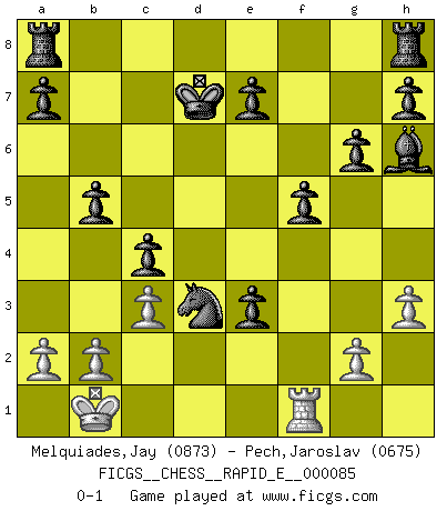 Last move : 0-1 2012 September 23 3:0:58 [Event "FICGS__CHESS__RAPID_E__000085"] [Site "FICGS"] [Date "2012.07.28"] [Round "1"] [White "Melquiades,Jay"] [Black "Pech,Jaroslav"] [Result "0-1"] [WhiteElo "0873"] [BlackElo "0675"] 1.e4 c5 2.Nf3 Nc6 3.c3 d5 4.Bb5 dxe4 5.Ne5 Bd7 6.Qa4 Nxe5 7.Bxd7+ Qxd7 8.Qxd7+ Kxd7 9.d3 Nxd3+ 10.Kd2 Nxf2 11.Rf1 Nd3 12.Ke3 f5 13.Nd2 g6 14.Nc4 Bh6+ 15.Ke2 Nxc1+ 16.Ke1 Nd3+ 17.Kd1 b5 18.Ne5+ Nxe5 19.Kc2 Nd3 20.Rad1 Nf6 21.h3 Nd5 22.Kb3 c4+ 23.Kc2 Ne3+ 24.Kb1 Nxf1 25.Rxf1 e3 0-1 Sicilian defense Player Black won this chess game. Follow this game move after move (download)The most important feature of the Chess position is the activity of the pieces. This is absolutely fundamental in all phases of the game: Opening, Middlegame and especially Endgame. The primary constraint on a piece's activity is the Pawn structure. (Michael Stean) Rubinstein ist ein Turmendspiel, welches die Götter vor tausenden von Jahren begannen. (Savielly Grigorievitsch Tartakower) Debemos de asegurarnos de que el Ajedrez no se convierta en un lenguaje muerto, muy interesante, pero solo para un grupo muy pequeño. (Sytze Faber) D'abord les bases : Jouez et étudiez, puis étudiez et jouez, ensuite jouez et étudiez, puis étudiez et jouez. Deuxièmement : Donnez toujours le meilleur de vous-même ! (Ken Smith) I have opinions of my own - strong opinions - but I don't always agree with them. (George Bush)