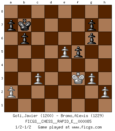 Last move : 1/2-1/2 2012 August 8 20:31:57 [Event "FICGS__CHESS__RAPID_E__000085"] [Site "FICGS"] [Date "2012.07.28"] [Round "1"] [White "Goti,Javier"] [Black "Bromo,Alexis"] [Result "1/2-1/2"] [WhiteElo "1200"] [BlackElo "1229"] 1.c4 e5 2.g3 Nf6 3.Nc3 Bb4 4.Bg2 c6 5.e3 Bxc3 6.bxc3 d5 7.cxd5 cxd5 8.Ba3 Nc6 9.Ne2 Bg4 10.f3 Bh5 11.O-O e4 12.fxe4 Nxe4 13.Qe1 Qc7 14.Nf4 Bg6 15.Nxg6 hxg6 16.d3 Nf6 17.e4 O-O-O 18.Rb1 dxe4 19.dxe4 Ne5 20.Qe3 b6 21.Rbd1 Nc4 22.Qe2 Nxa3 23.Qa6+ Kb8 24.Qxa3 Rxd1 25.Rxd1 Rd8 26.Rd4 Ng4 27.Rd5 Ne3 28.Rxd8+ Qxd8 29.Qc1 Nxg2 30.Kxg2 f5 31.Qf4+ Kb7 32.e5 Qd5+ 33.Qf3 Qxf3+ 34.Kxf3 1/2-1/2 English Opening Kingside Castling by player White (move 11) Queenside Castling by player Black (move 17) This chess game ended in a draw. Follow this game move after move (download)No Chess Grandmaster is normal; they only differ in the extent of their madness. (Viktor Korchnoi) Sie bekommen vielleicht den Eindruck, dass die Spitzenspieler überhaupt gar nicht so stark sind. Aber das stimmt nicht. Es ist eine Illusion. Mit einem Computer an der Seite ist es sehr leicht, Urteile zu fällen, aber wenn man alleine am Brett sitzt, sieht die Sache ganz anders aus. (Vladimir Kramnik) Aunque la mayoría de la gente disfruta observar las partidas de los grandes Maestros de ataque, algunos de los jugadores mas notables en la historia han sido los jugadores silenciosos posicionales. Lentamente ellos te aplastan despojandote de tu espacio, congestionando tus piezas y dejandote virtualmente sin nada que hacer. (Yasser Seirawan) Vouloir jouer aux échecs contre soi-même est aussi paradoxal que vouloir marcher sur son ombre. (Stefan Zweig) Begin at the beginning and go on till you come to the end; then stop. (Lewis Carrol, Alice in Wonderland)